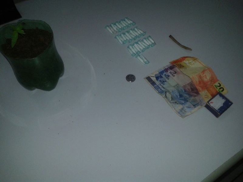 Segundo a PM, a equipe realizada um patrulhamento preventivo quando a dupla demonstrou nervosismo ao avistar a viatura, o que motivou os policiais a conduzirem uma abordagem. Com Danilo Maciel Correia, de 21 anos, os patrulheiros encontraram um vaso com uma muda de maconha além de um cigarro do entorpecente pronto para o consumo. Com Leonardo Rodrigo Bastos, também de 21 anos, encontraram 27 pinos de cocaína e R$ 25 em dinheiro.