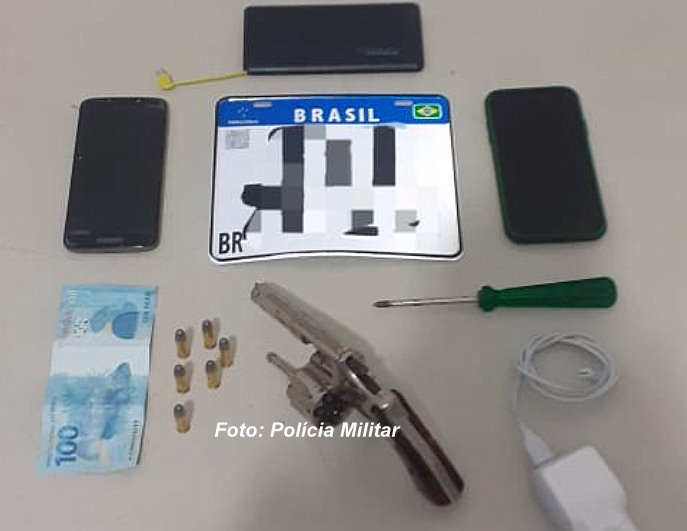 Arma, placa adulterada da moto e celulares apreendidos pela PM.