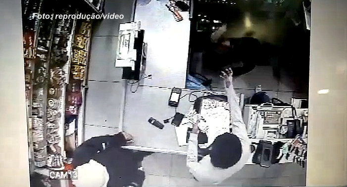 Nas imagens, comerciante entrega dinheiro a um dos criminosos.