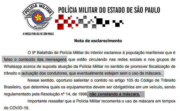 O comando do 9º Batalhão da Polícia Militar em Marília reafirmou que não haverá aplicação de multas e todos os rumores divulgados nas redes sociais se tratam de "fake news".