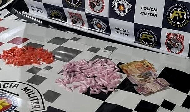Foram apreendidos 109 pinos de cocaína e mais 77 pinos com crack, além de R$ 97,71 em dinheiro.