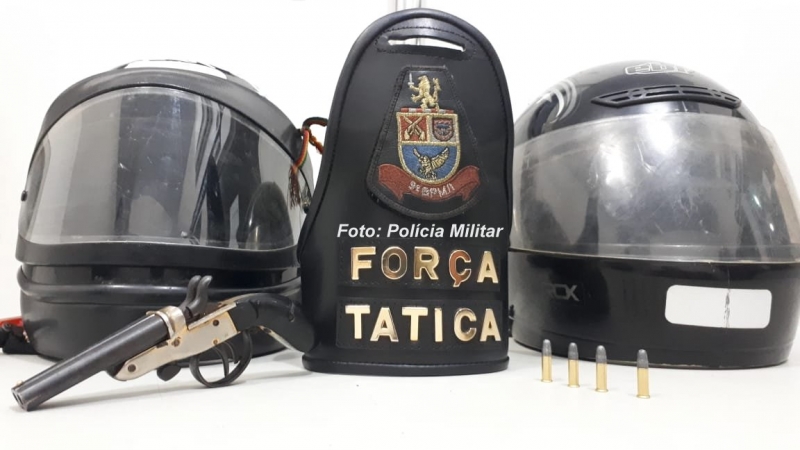 Os policiais militares da Força Tática estavam em patrulhamento pela região central da cidade quando depararam com uma moto ocupada por duas pessoas. Como eles estavam com blusa moleton de gorro, esse detalhe chamou a atenção e foi feita abordagem no cruzamento da avenida Santo Antonio com a rua 7 de Setembro.
