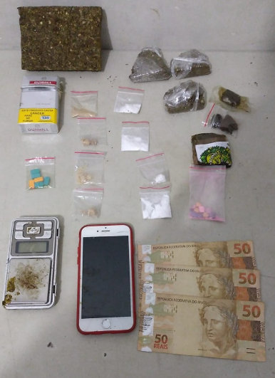 Foram apreendidas porções de cocaína, haxixe, 21 comprimidos de ecstasy, maconha, cogumelos alucinógenos, micropontos de LSD, porções de cristais de MD, uma balança de precisão, caderno com anotações sobre venda de drogas e R$ 2.717 em dinheiro.