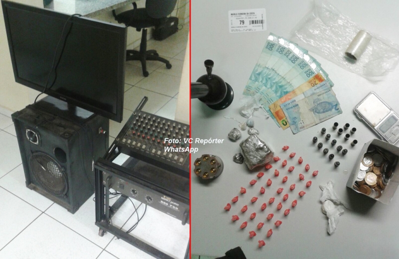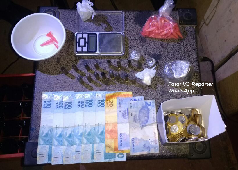 Foram apreendidas 16 munições de calibre 38, bem como 100 gramas de maconha, 31 gramas de crack e 16 gramas de cocaína, balança de precisão, material para embalagem de drogas e R$ 679,00 da venda de entorpecente. Na casa, os policiais recuperaram também objetos que foram deixados por usuários de drogas e que haviam sido furtados na cidade, inclusive a aparelhagem de som levada de uma igreja.
