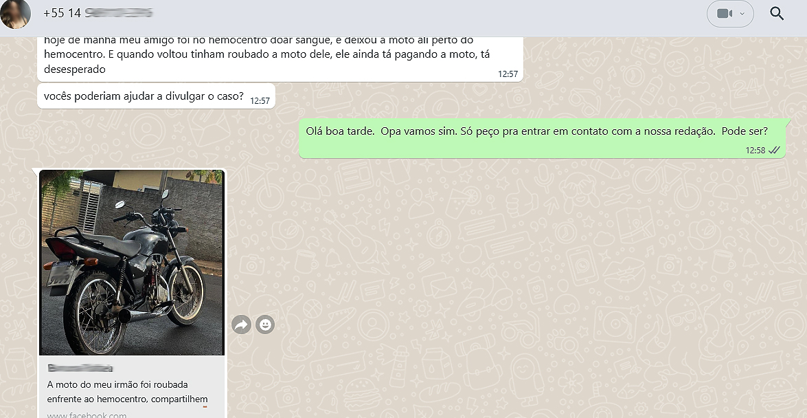 A vítima, de 20 anos, relatou que havia estacionado sua motocicleta Honda, ano 2006, em um bolsão localizado na rua Lourival Freire, com objetivo de doar sangue para um amigo. Após o gesto de cidadania, veio a decepção: a moto não estava mais no local. A alternativa foi registrar o boletim de ocorrência. Além disso, familiares pediram ajuda ao Visão Notícias para compartilhar o furto.