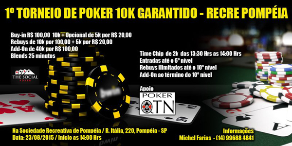 A Sociedade Recreativa de Pompeia vai sediar no próximo dia 23 de agosto (domingo) o 1º Torneio de Poker Texas Holden 10K. O objetivo é expandir o esporte na nossa região que possui apenas dois clubes na região.