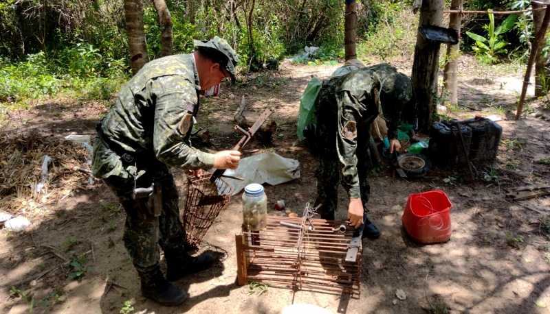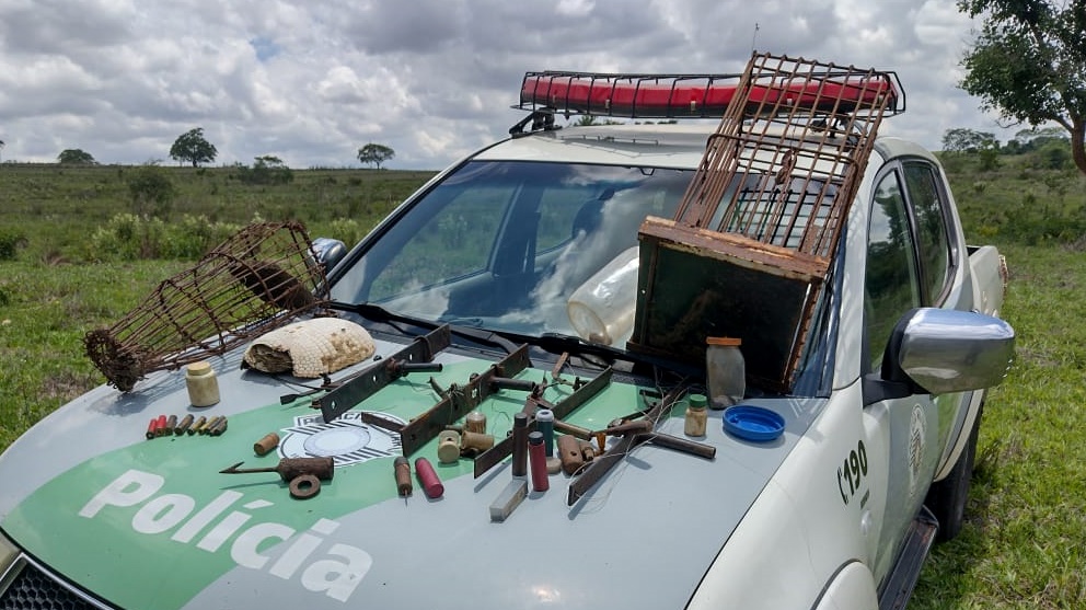 Os policiais apreenderam diversos petrechos de caça como "canhãozinhos" (armadilhas de fogo para caça), cartuchos de diversos calibres (espingardas), espoletas, esferas de chumbo para carregamento de cartuchos, armadilhas e fisgas.