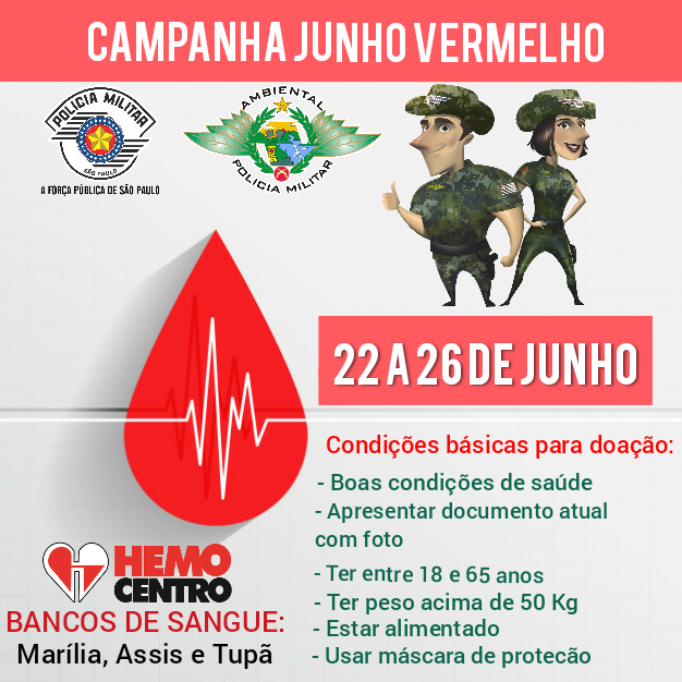 Em comemoração aos 43 anos de criação do 2º Batalhão de Policiamento Ambiental, policiais ambientais de Marília, Assis e Tupã estão participando esta semana da Campanha “Junho Vermelho”. Até sexta-feira, eles estarão fazendo a doação de sangue no hemocentro e também nos bancos de sangue.