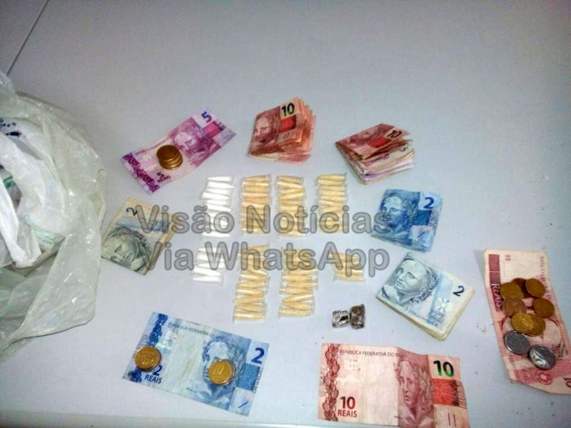 Após uma vistoria no local, os policiais encontraram uma sacola plástica. Dentro dela, 54 pinos de crack, 15 pinos de cocaína e duas trouxinhas de maconha foram localizadas, além de R$ 203.