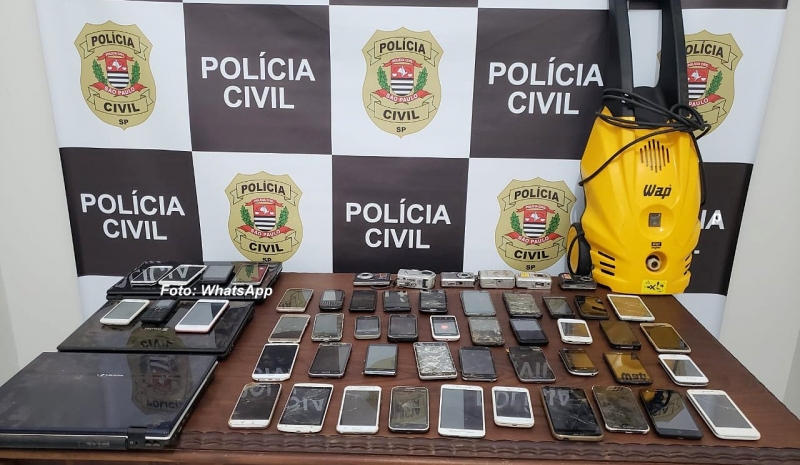 Os policiais apreenderam também seis máquinas fotográficas, quatro notebooks e uma lavadora de alta pressão em residência.