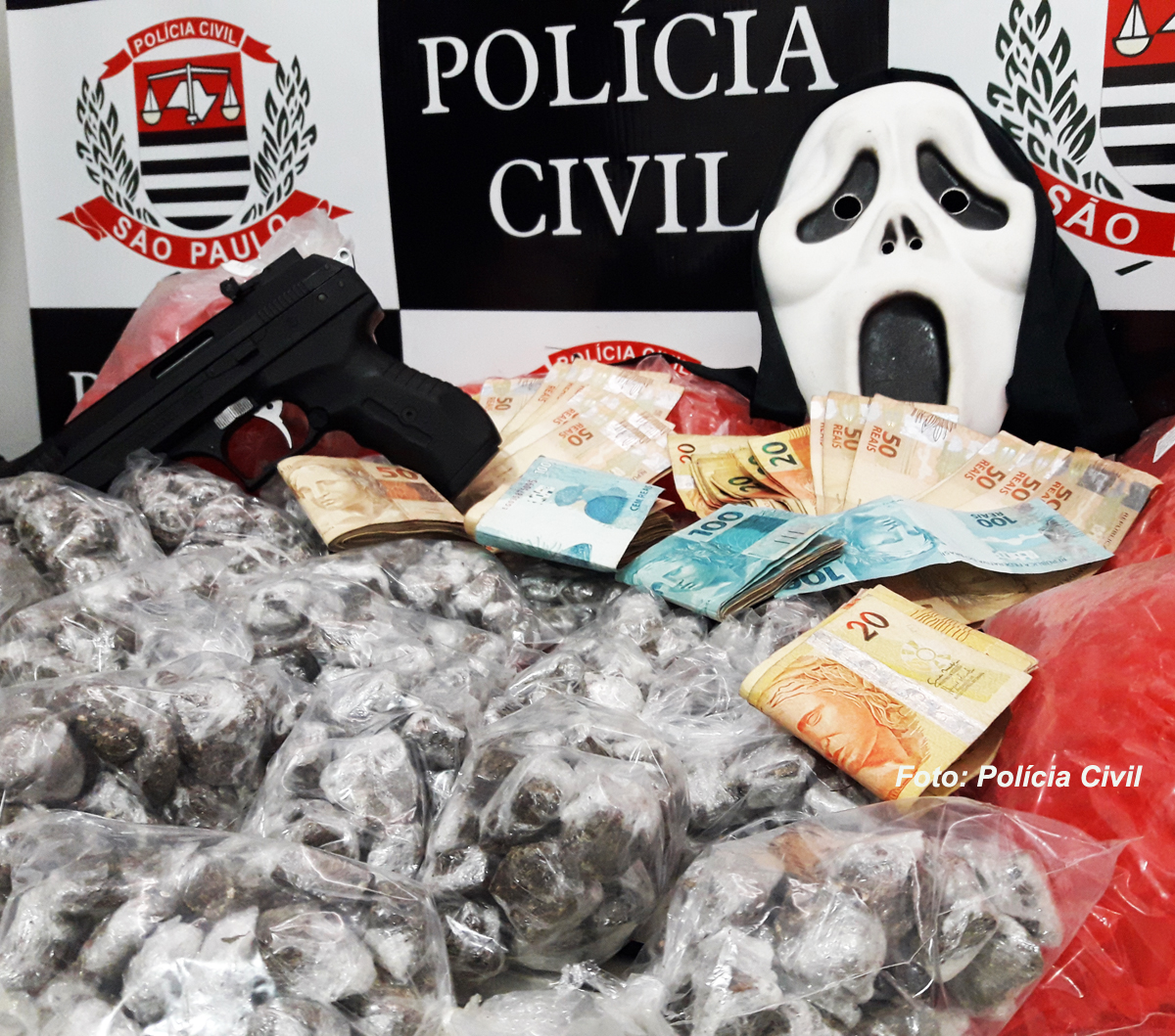A operação foi realizada no bairro Parquue das Azaléias, na zona Sul. Foram apreendidas 548 porções de maconha, cinco sacos com pinos vazios (usados para embalar drogas), além de R$ 5 mil em dinheiro, um simulacro de arma de fogo, e uma máscara do filme “Pânico”.