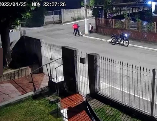 Imagens das câmeras de segurança, registraram o momento qm que o assaltante passa de moto pelo casal, volta e rende Renan e a namorada.