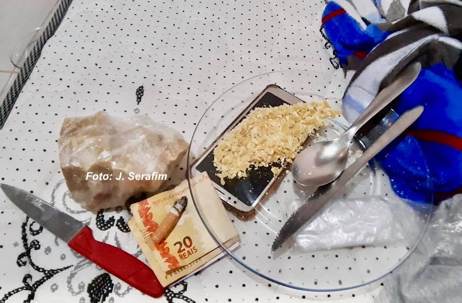 No local, foram apreendidas 220 porções de cocaína e 67 de crack já embaladas e outras porções dos entorpecentes que ainda seriam preparadas.