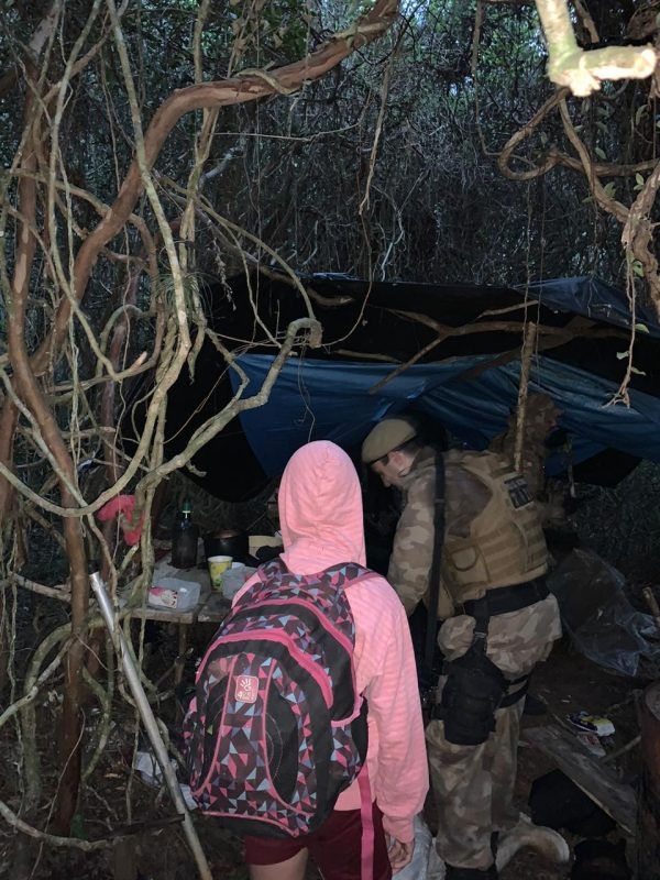 A menina estava vivendo acampada em condições precárias, segundo a polícia. Durante a busca no acampamento, foi localizado e apreendido um revólver calibre 32 com seis munições.