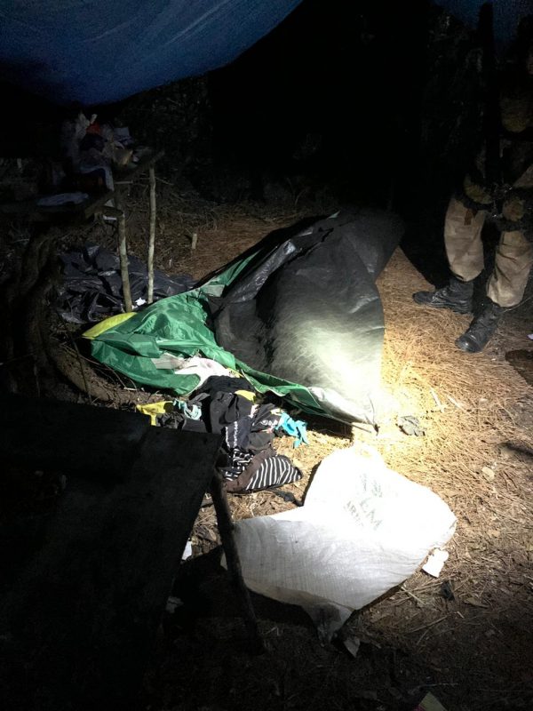 No cativeiro, os policiais encontraram uma barraca improvisada com lonas e ainda objetos pessoais dos dois. Além disso, foram apreendidas uma arma e munições. O ex-vizinho é o principal suspeito do crime. Ele fugiu e está sendo procurado.