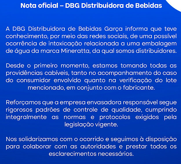 Outro lado - A empresa responsável pela distribuição da água mineral da marca Mineratta divulgou uma nota oficial sobre o caso. Confira abaixo: