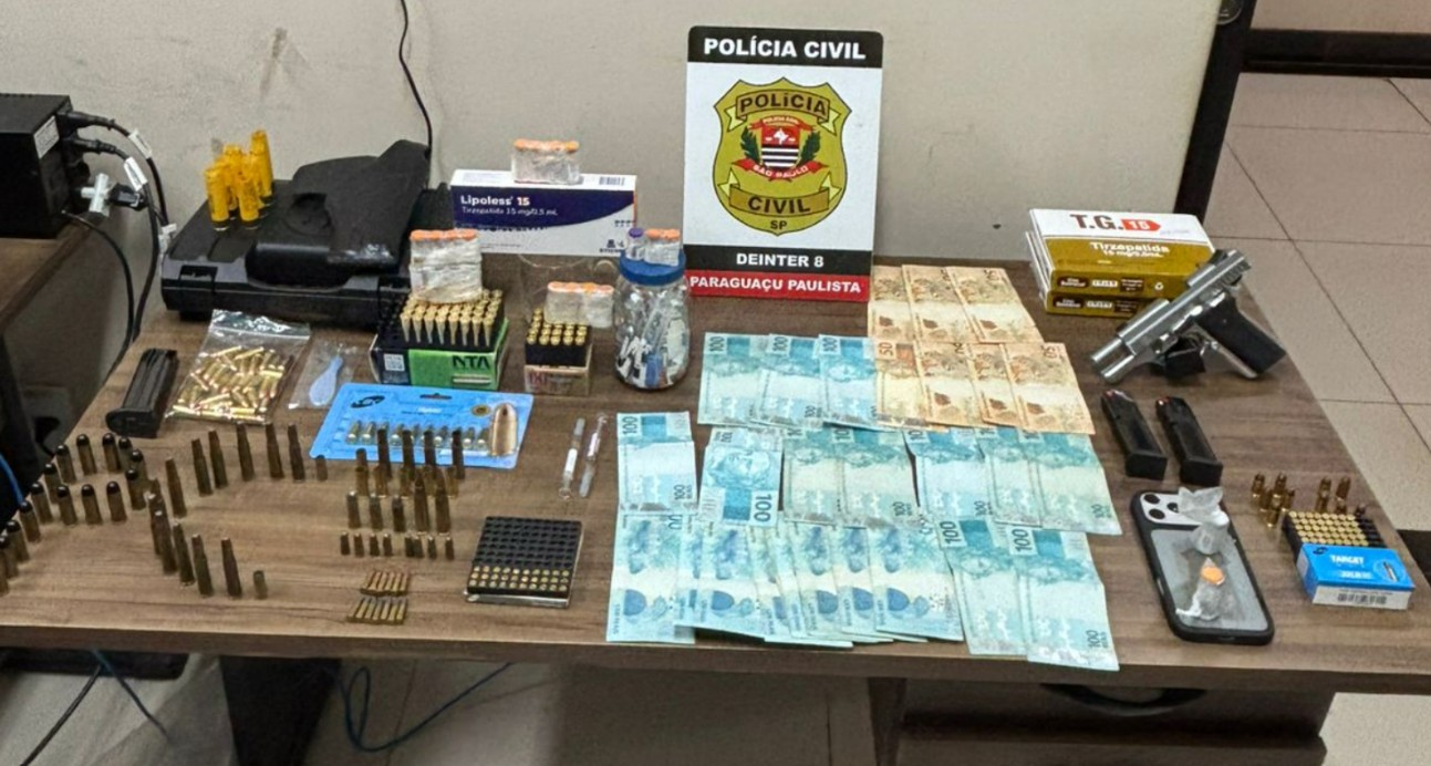 Durante a operação, foram cumpridos 10 mandados de busca e apreensão, com apoio de policiais civis da Delegacia Seccional de Assis. Em um dos endereços investigados, os policiais apreenderam canetas emagrecedoras, dinheiro em espécie e munições de diversos calibres. Em outro local, foi localizada uma pistola calibre .380, além de munições.