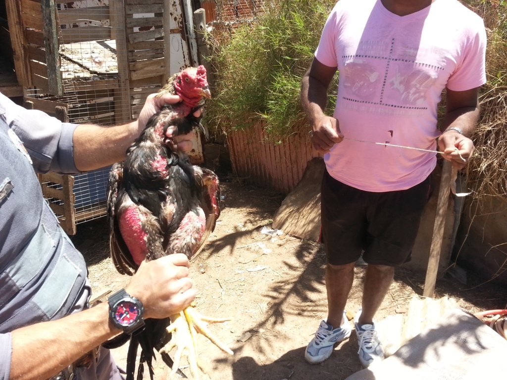 De acordo com informações da PM, as equipes do 1º Pelotão Operacional receberam denúncia e após averiguação constataram que no quintal de uma residência dois galos índios estariam confinados, com claros indícios de maus tratos, como mutilação das esporar naturais, cristas e barbelas, aparentando que os animais eram utilizados em rinha de galos.