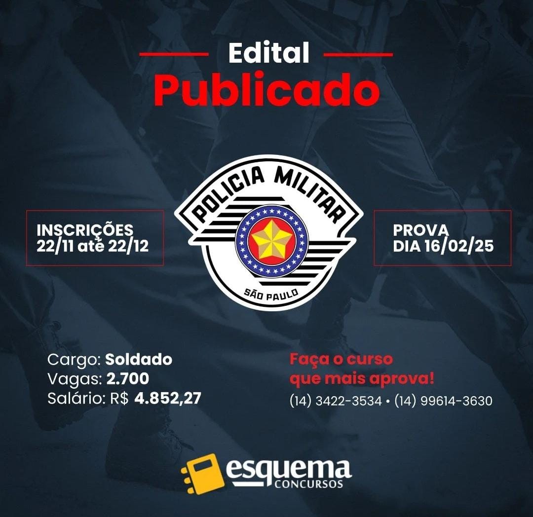O Governo de São Paulo iniciou nesta sexta-feira (22) as inscrições para o concurso público que prevê a contratação de 2,7 mil soldados de 2ª classe para a Polícia Militar (PM). Os interessados devem acessar site Fundação Getúlio Vargas. O prazo termina em 22 de dezembro.