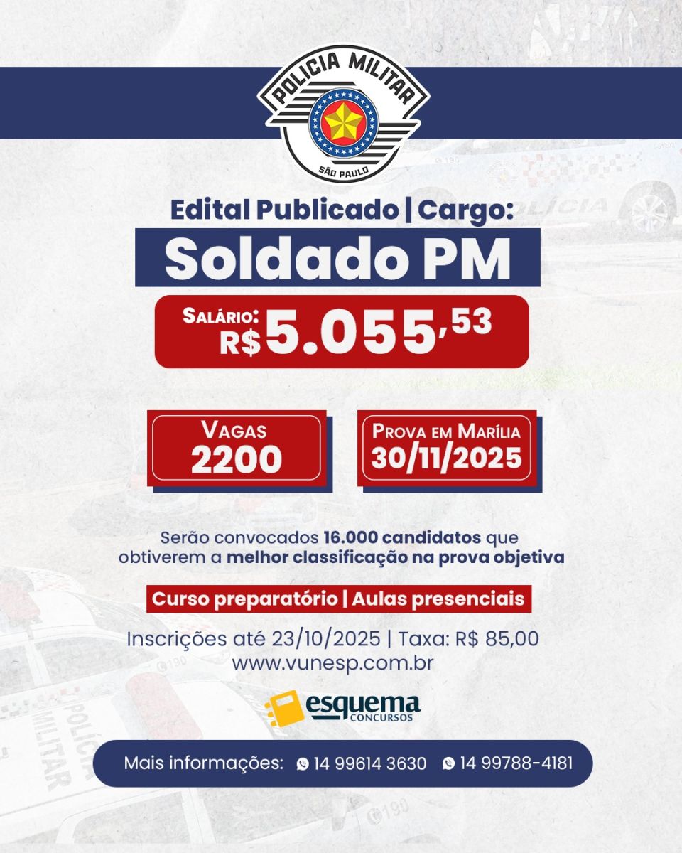 Com o início oficial das inscrições, é o momento dos candidatos se prepararem. Em Marília, o Esquema Concursos realiza um curso preparatório com aulas presenciais, acompanhamento de perto e foco em resultados reais.