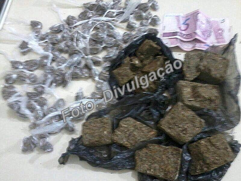 Porções de drogas, dinheiro e celular foram apreendidos pela PM.