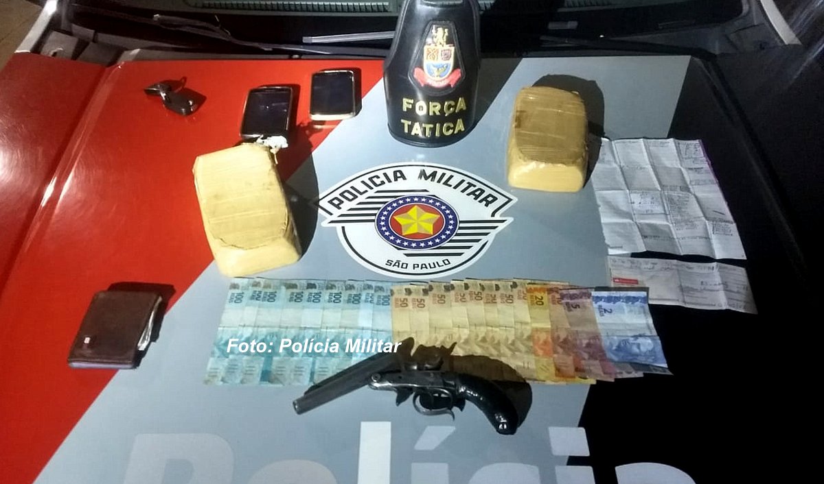 No carro foram localizados dois tabletes de crack totalizando dois Kilos, avaliado em R$ 40 mil reais, uma arma tipo garrucha cal 38, R$1.337,00 e um cheque no valor de três mil reais.