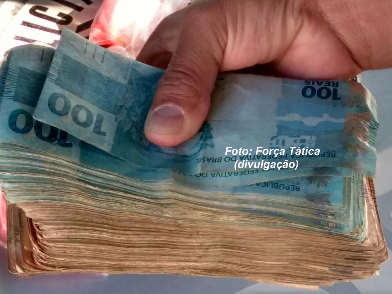 Os PMs receberam denúncia anônima e, ao vistoriar o endereço, encontraram todo o dinheiro, uma porção grande de cocaína, cerca de mil pinos vazios, além de uma extensa contabilidade do tráfico. Como o homem não se apresentou à polícia (ele já tem várias passagens pelo mesmo crime), a sua mulher que estava na casa é quem acabou sendo presa (mãe de três filhos).