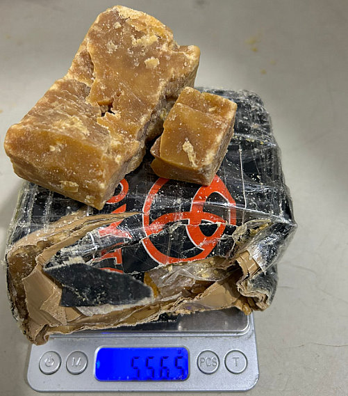 Mesmo não nada de "errado" com ele, resolveram ir até à casa dele, onde encontraram dois potes contendo cocaína, uma sacola com três pedras brutas de crack (foto), 131 pinos prontos para venda com cocaína, diversos apetrechos para comercialização de drogas, além de duas munições de espingarda calibre 28.