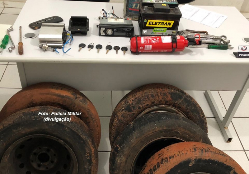 localizados vários produtos, como baterias e rodas com pneus, além de chaves "mixas" - usadas para conseguir abrir e ligar veículos.
