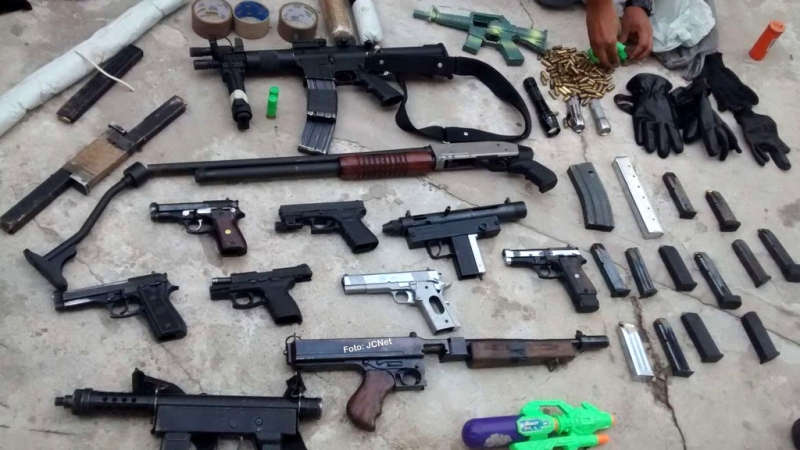 No local, foram apreendidos armamentos pesados como fuzis AR-15, metralhadoras, pistolas e até bananas de dinamite.