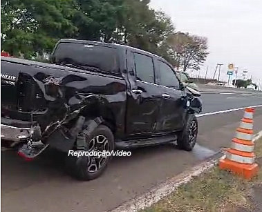 Com o impacto, os dois veículos rodopiaram na pista, sendo que a caminhonete (uma Hilux ano 2024) acabou atingindo a lateral da carreta e o outro carro contra a mureta de concreto que divide as pistas.