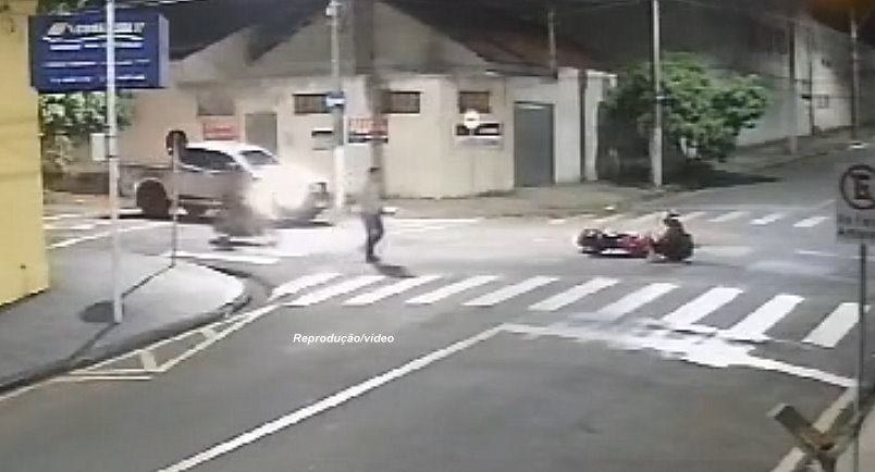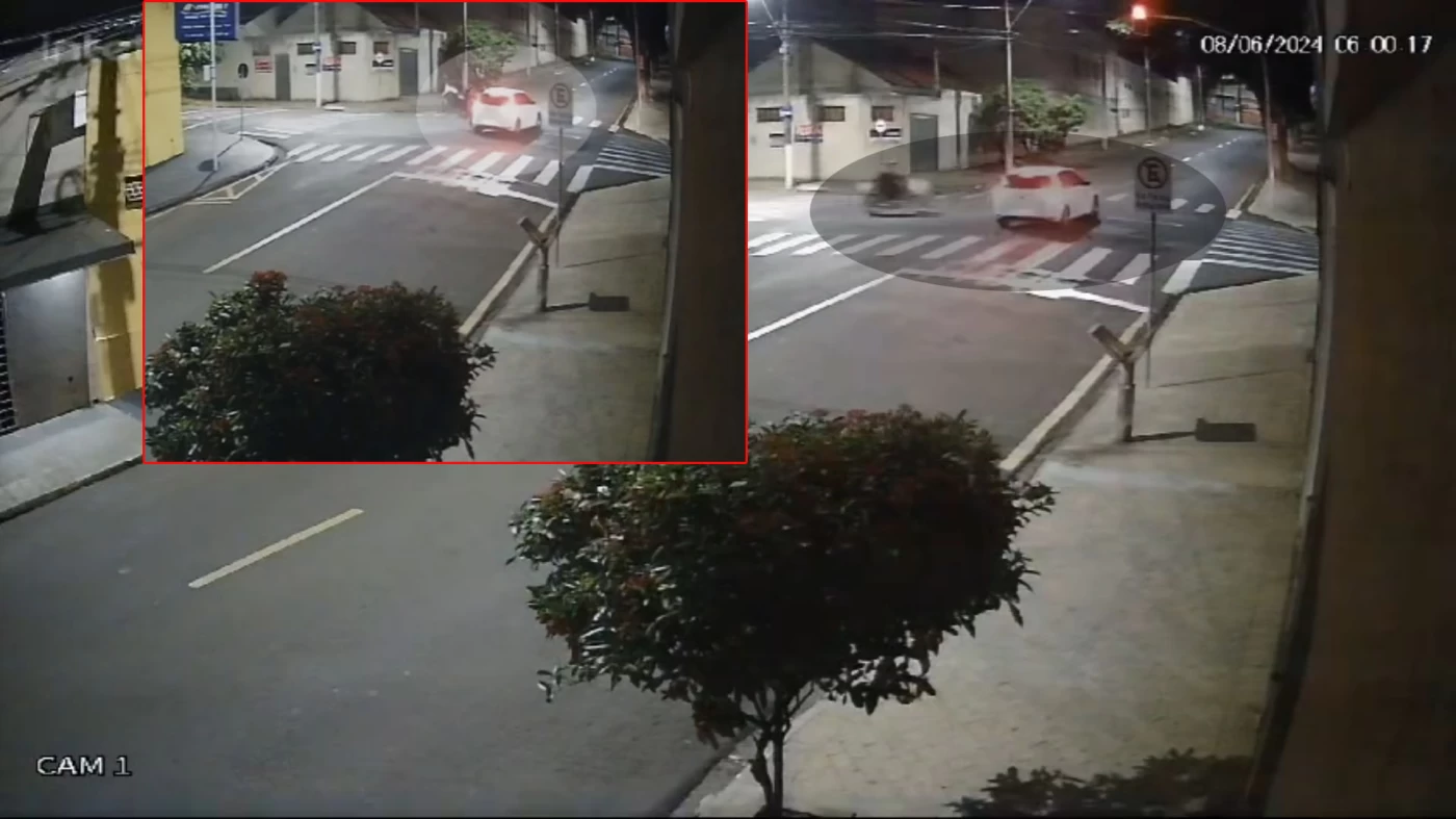 Pelas imagens é possível perceber que o condutor chega a frear no cruzamento, mas em seguida avança o final vermelho, cortando a frente da motocicleta.