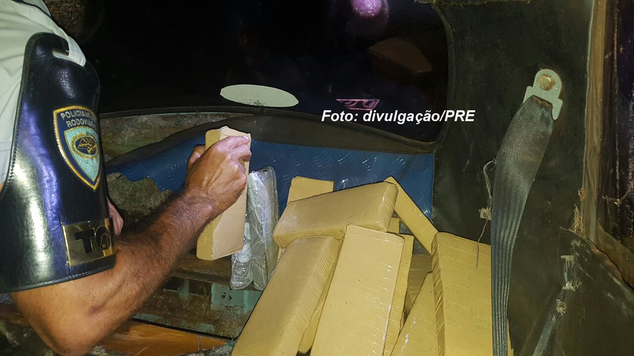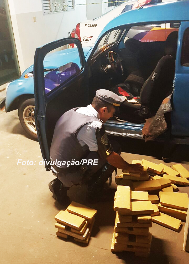 tráfico: um fusca. A Polícia Rodoviária Estadual apreendeu esta madrugada em Assis cerca de 50 quilos de maconha. A droga estava escondida no fundo falso de um fusca. Três pessoas foram presas em flagrante (duas delas em outro carro que escoltava o veículo) na Polícia Federal em Marília.