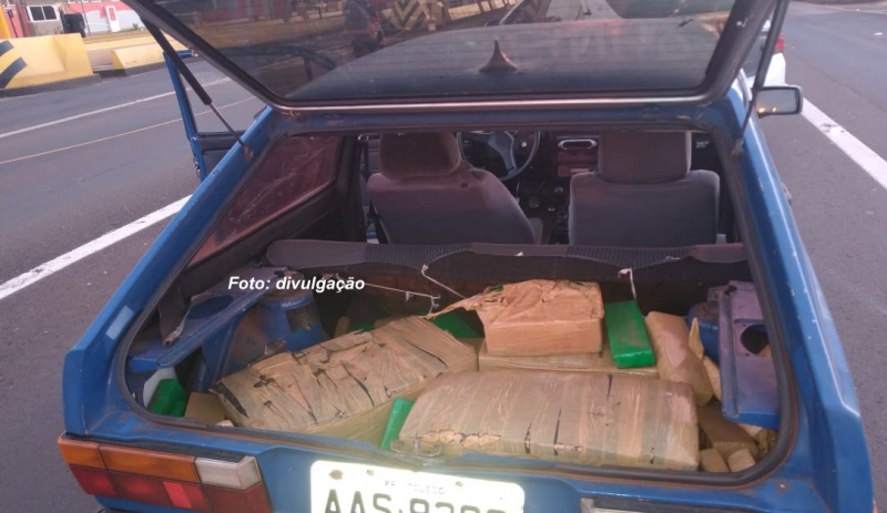 Por isso, foi feita vistoria no veículo, sendo localizado no porta-malas grande quntidade de maconha (calcula-se mais de 100 quilos). Além disso, foi abordado ainda um outro carro, modelo Siena, ocupado por duas pessoas, que eram usados como "batedores".