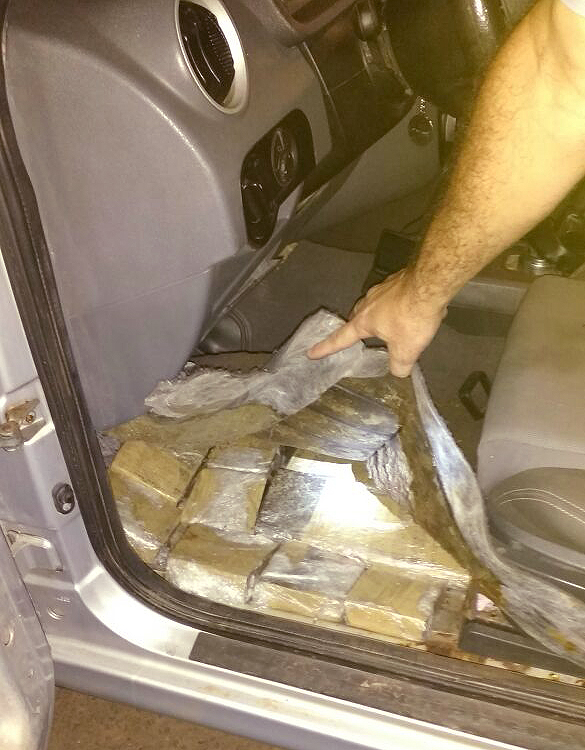 Na vistoria, foram encontrados vários tabletes de maconha, que estavam escondidos embaixo do carpete dos bancos de motorista e passageiro, dentro do acento do motorista e passageiro, dentro dos bancos traseiro (acento e encosto), dentro do forro das quatro portas.