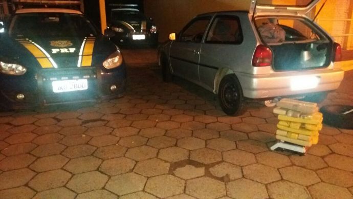 Os inspetores deram ordem de parada ao veículo VW/Gol, com placas AIR-0837 (da cidade de Vera Cruz) e em vistoria no porta-malas, no local onde deveria estar o estepe, foram encontrados 20 barras de maconha, totalizando 18 quilos.