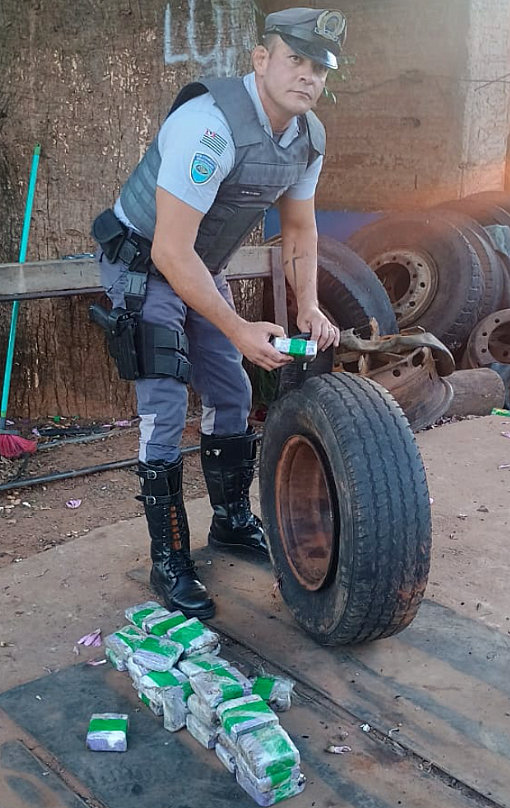 Desta vez, os traficantes tentaram "inovar", colocando os tabletes de maconha no estepe, mas não conseguiram ir muito longe. A droga pesou 22,4 quilos.