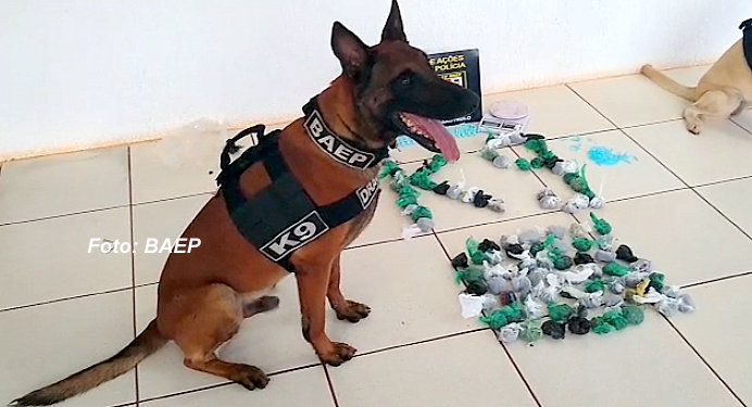 O abordado confessou a prática de tráfico de drogas. Com o auxílio de cães de faro, os policiais localizaram 60 pinos de cocaína e 103 porções de maconha, além de uma balança digital de precisão.