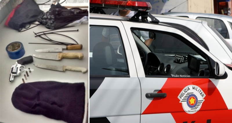Em cumprimento de mandado de busca e apreensão por conta de tráfico de drogas e receptação, os policiais foram até uma casa localizada na rua Valentina Cantu, no Labienópolis, e deteram quatro maiores de idade que estavam no interior da residência. Com a presença de um delegado da Polícia Civil, foi feita a busca no interior do imóvel, onde um revólver .38 com numeração raspada foi localizado. Além da arma de fogo, três facas, capuz, lacres plásticos e fita prateada (que normalmente são utilizados durante assaltos) também foram encontrados e apreendidos.