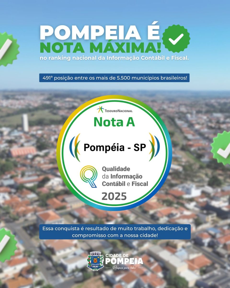 A cidade de Pompeia acaba de alcançar uma das maiores distinções de gestão pública do país: o Selo A em Qualidade da Informação Contábil e Fiscal 2025, concedido pelo Tesouro Nacional.
