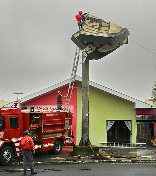 BOMBEIROS - Nesta tarde, pelo menos cinco equipes do Corpo de Bombeiros prosseguiram no trabalho de cortes de árvores. A estimativa inicial é de que pelo menos 300 delas tombaram, atingindo fios de energia, as casas e também caindo no meio da rua. Isso sem falar em placas e demais objetos que ficaram pendurados, ameaçando as pessoas, como na avenida João Ramalho (foto/esquerda).
