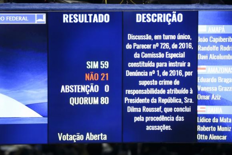 Por 59 votos a 21, o plenário do Senado aprovou hoje (10) o relatório do senador Antonio Anastasia (PSDB-MG) que julga procedente a denúncia contra a presidenta afastada Dilma Rousseff por crime de responsabilidade. Dilma agora vai a julgamento final pelo plenário do Senado.