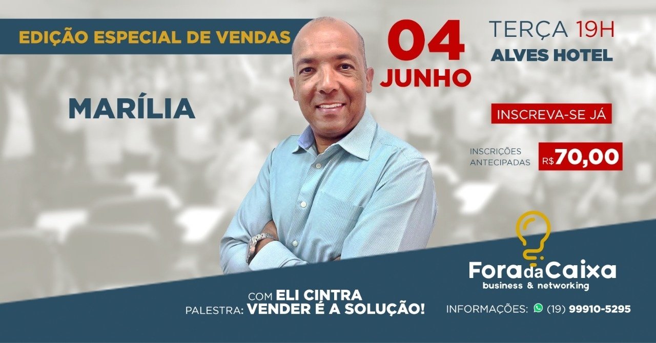 Marília recebe no próximo dia 4 de junho, a partir das 19 horas, mais uma edição do Fora da Caixa, ambiente totalmente voltado para o fortalecimento de redes de contatos, compartilhamento de experiências empreendedoras e crescimento mútuo para empreendedores, comerciantes, donos de pequenos, médios e grandes negócios, profissionais liberais e consultores.
