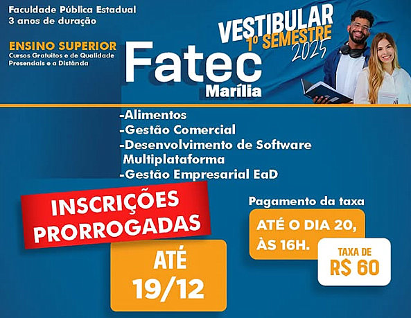 As inscrições para o processo seletivo das Faculdades de Tecnologia do Estado (Fatecs) para o primeiro semestre de 2025 foram prorrogadas até a próxima quinta-feira (dia 19), exclusivamente pelo site vestibular.fatec.sp.gov.br. A prova será aplicada em 12 de janeiro.