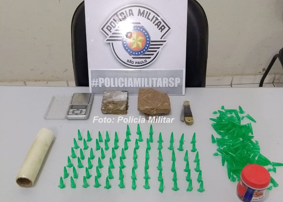 No local, o trio estava embalando entorpecentes. Foram apreendidos 75 pinos de cocaína, 83 pinos vazios, dois tabletes de maconha e material para "batizar" a cocaína ("pó royal") e também para embalo, além de um caninete. O rapaz foi preso em flagrante.