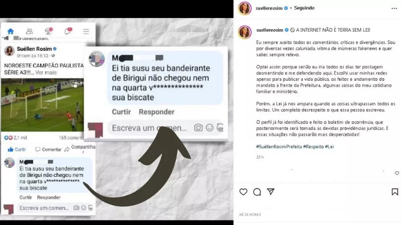 Um comentário machista nas redes sociais que teve como alvo a prefeita de Bauru, Suéllen Rosim, virou caso de polícia. Suéllen, que é a primeira mulher a se tornar prefeita da cidade, registrou um boletim de ocorrência após ter sido xingada de "biscate" em uma postagem no Facebook.