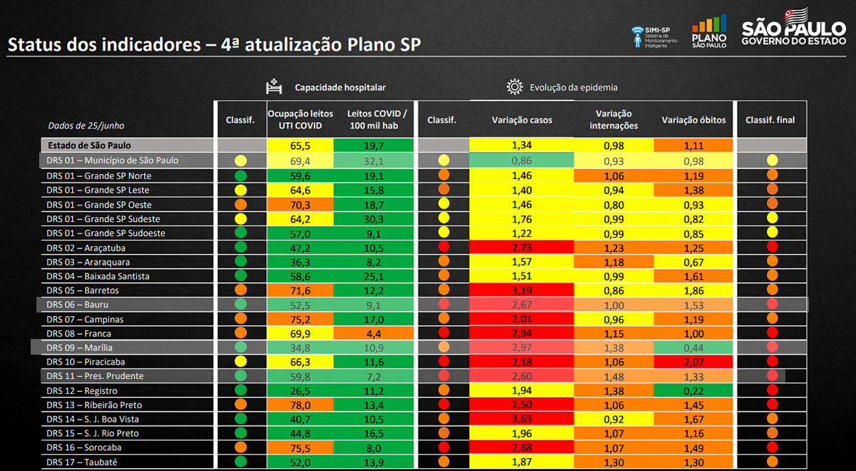 Os indicadores que são usados pelo Estado para definir a classificação regional. Região de Marília ficou "verde" em três dos cinco ítens, mesmo assim a classificação final indicou "vermelho"