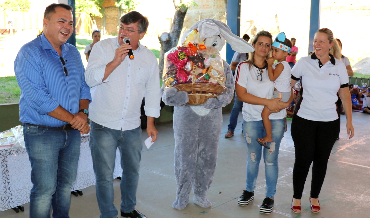 O prefeito Daniel Alonso participou ontem da Festa de Páscoa da Emei (Escola Municipal de Educação Infantil) 1,2 Feijão com Arroz, na zona norte de Marília. Ao todo, mais de 18.500 alunos receberam ovos de chocolate em toda a Rede Municipal de Educação de Marília.
