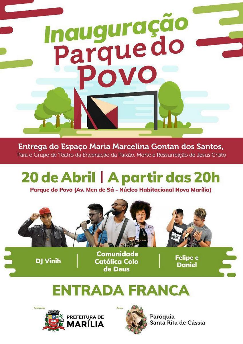 O Prefeito Daniel Alonso inaugura neste sábado (20), à partir das 22h, o “Parque do Povo” na Zona Sul de Marília. O local recebeu nos últimos dias várias melhorias e agora definitivamente será entregue a população. Um espaço para o Teatro da Paixão de Cristo também será entregue oficialmente a Comunidade da Paróquia Santa Rita de Cássia.