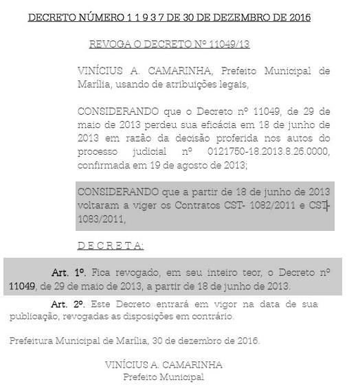 O ato, assinado pelo prefeito Vinicius, revogou o Decreto nº 11049, de 29 de maio de 2013 que tratava justamente da contratação emergencial das duas empresas que desde aquela época estão operando na cidade, em substituição à Empresa Circular de Marília.